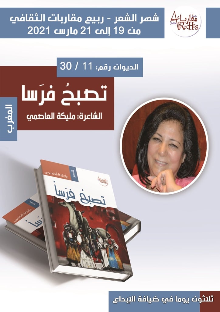 تنفيذا لمقترحها الإبداعي بنشر 30 ديوانا في شهر واحد من 19 فبراير الى 21 مارس 2021 تحت شعار : “لأن الشعر يستحق”، ضمن برنامج ربيع المؤسسة الثقافي 2021، أطلقت مؤسسة مقاربات العنوان الإبداعي الحادي عشر للشاعرة المغربية مليكة العاصمي بعنوان:” تصبح فرسا” لوحة الغلاف للفنان الكبير زهير حسيب .