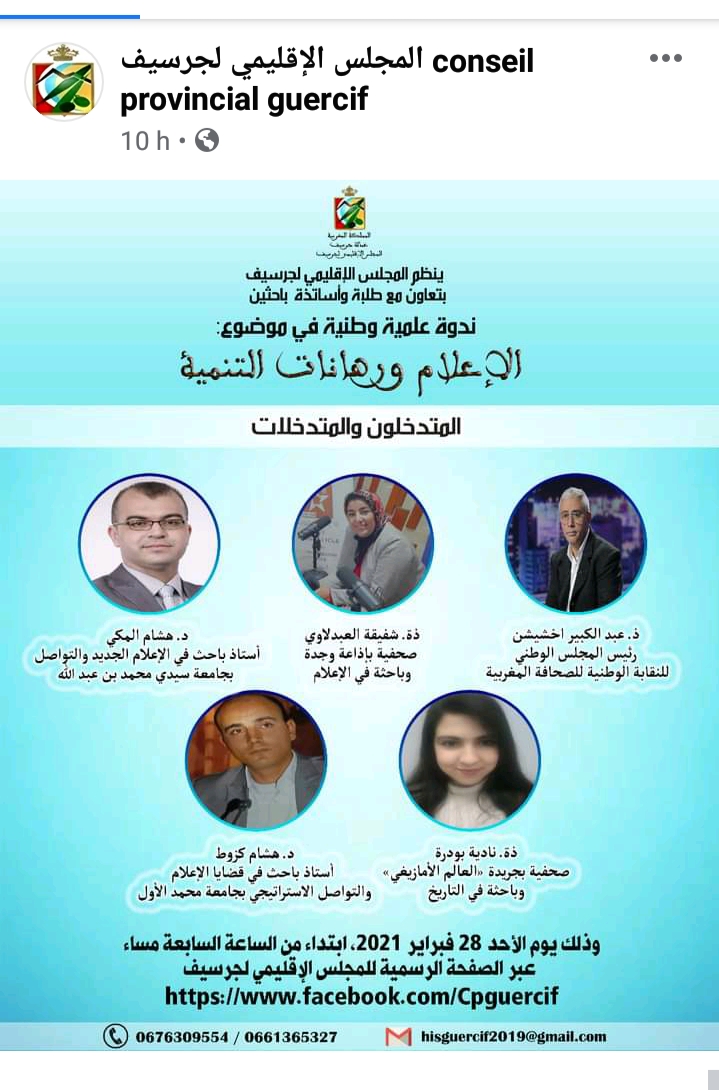 نظم المجلس الإقليمي لجرسيف بتعاون مع طلبة وأساتذة باحثين ندوة علمية وطنية حول موضوع :”الإعلام ورهانات التنمية”،وذلك يوم الأحد 28فبراير 2021،ابتداءا من الساعة الثامنة مساءا عبر الصفحة الرسمية للمجلس الإقليمي بجرسيف .