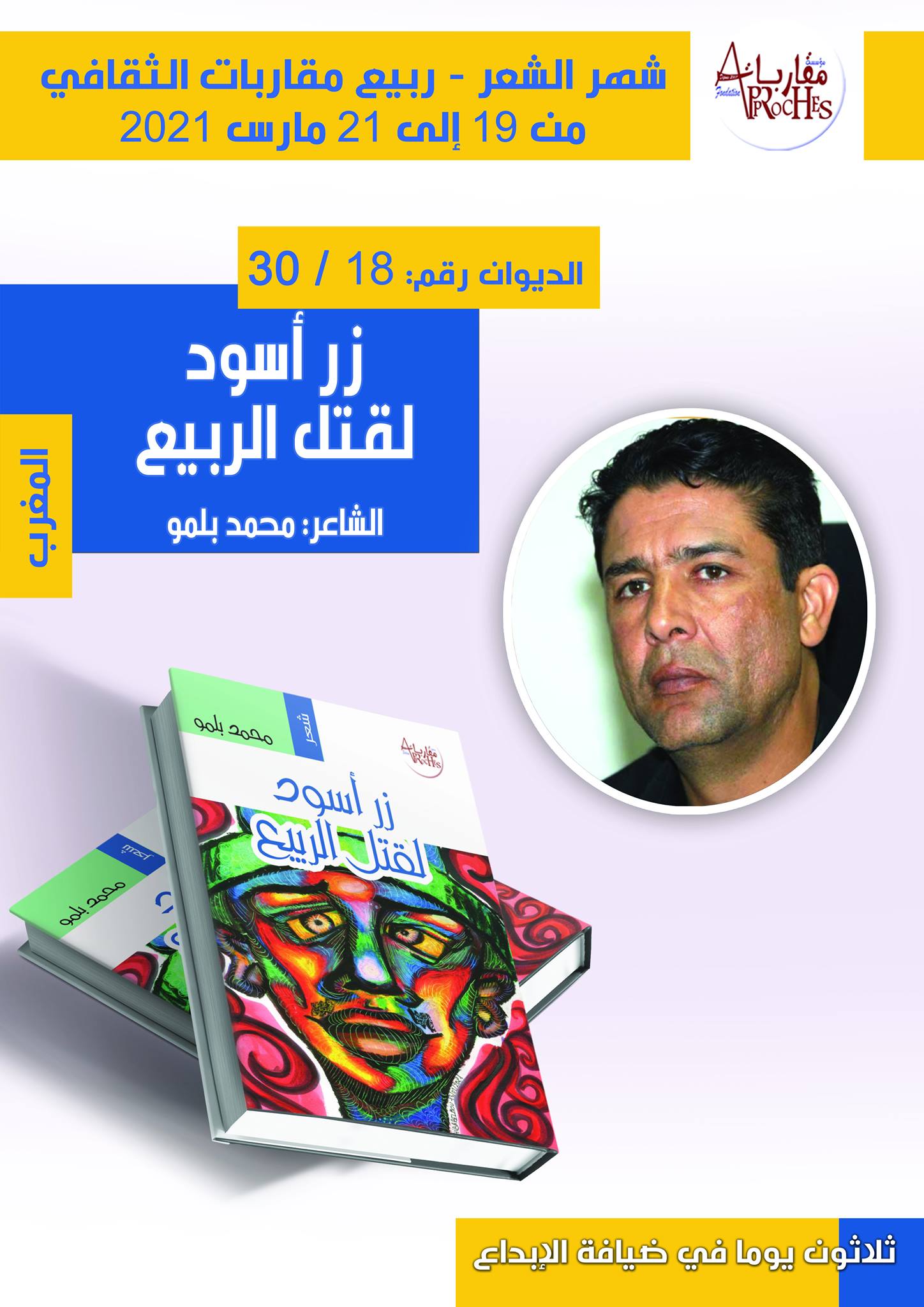 تنفيذا لمقترحها الإبداعي بنشر 30 ديوانا في شهر واحد من 19 فبراير الى 21 مارس 2021 تحت شعار : “لأن الشعر يستحق”، ضمن برنامج ربيع المؤسسة الثقافي 2021، أطلقت مؤسسة مقاربات العنوان الإبداعي الثامن عشر للشاعر المغربي محمد بلمو بعنوان:” زر أسود لقتل الربيع” لوحة الغلاف للفنانة الواعدة هبة بلمو. .