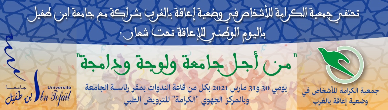 في مبادرة ذات أبعاد نبيلة، تخلد جمعية الكرامة للأشخاص في وضعية إعاقة بالغرب بشراكة مع جامعة ابن طفيل اليوم الوطني للإعاقة يومي الثلاثاء 30 والأربعاء 31 مارس 2021 وذلك تحت شعار: “من أجل جامعة ولوجة ودامجة”