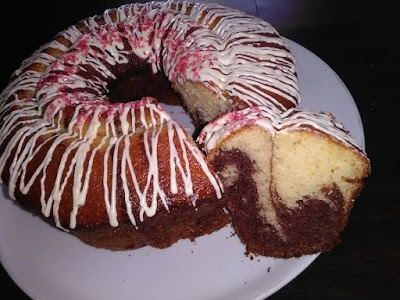 نصب خليط الكاكاو و نصب فوقه الخليط العادي ثم ندخل الكيكة للفرن