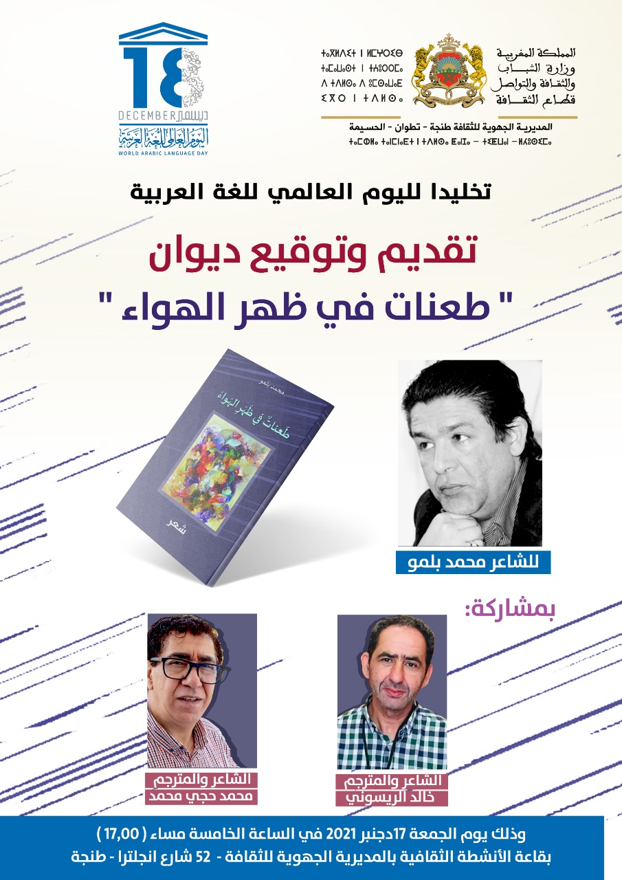 تخليدا لليوم العالمي للغة العربية الذي يصادف يوم 18 دجنبر من كل سنة، تنظم المديرية الجهوية لقطاع الثقافة بجهة طنجة تطوان الحسيمة، حفل توقيع المجموعة الشعرية “طعنات في ظهر الهواء” للشاعر والإعلامي محمد بلمو الصادرة ضمن منشورات جمعية الفكر التشكيلي، وذلك بقاعة الأنشطة الثقافية بمقر المديرية بمدينة طنجة، يوم الجمعة 17دجنبر 2021، على الساعة الخامسة مساء. اللقاء سيتميز بمشاركة كل من الشاعرين والمترجمين خالد الريسوني ومحمد حجي محمد بقراءتين في الكتاب.