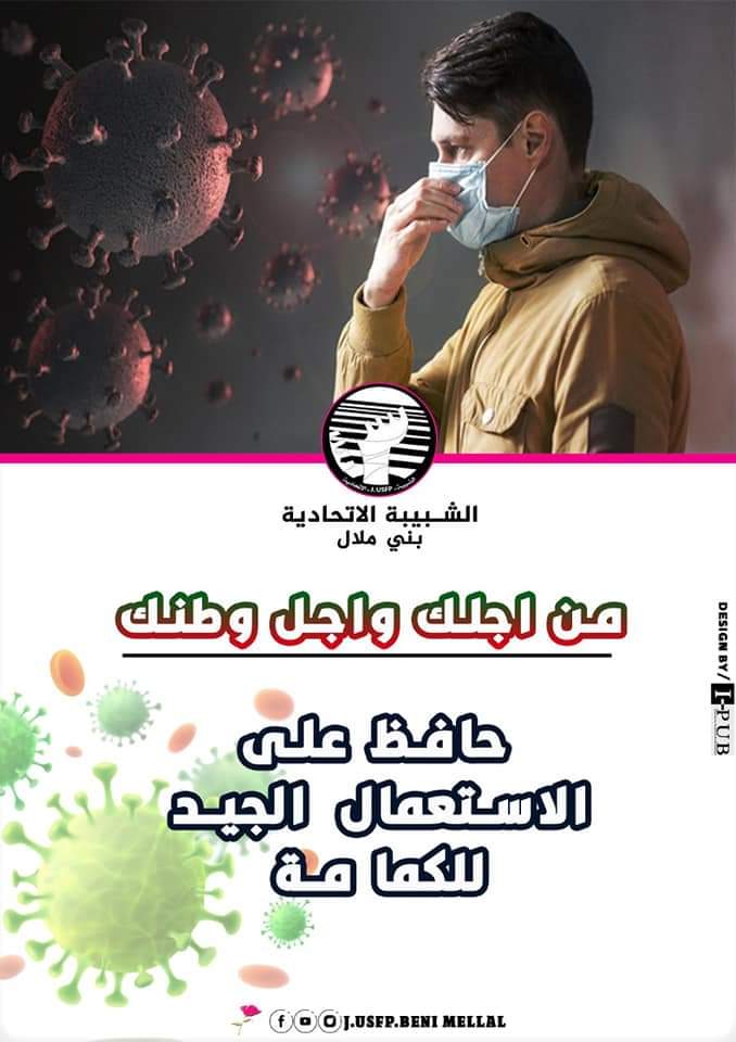 انخراطا في مضامين الخطاب الملكي، بمناسبة الذكرى 67 لثورة الملك والشعب، وتفاعلا مع الحملة الوطنية التي أطلقها المكتب الوطني للشبية الاتحادية ،أنجزت الشبيبة الاتحادية ببني ملال حملة تحسيسية توعوية بمخاطر فيروس “كورونا” المستجد “كوفيد-19”.، الحملة تستهدف الجانب الاعلامي بمواقع التواصل الاجتماعي من خلال تعميم وصلات ومطويات وملصقات ..