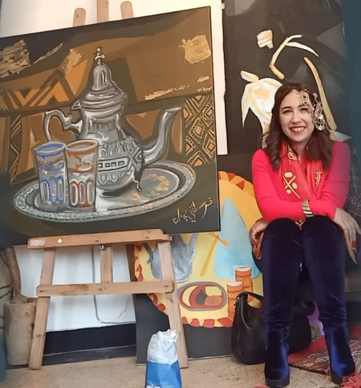لوحات ايمان فرحاتي في هذا المحفل، كؤوس مترعة بالمحبة والسلام، وعبق يضمخ الفضاء بفيض كرم مغربي أصيل، تهبه كؤوس الشاي للضيوف والحاضرين، والعابرين والسياح والوافدين على القبيلة في أقاصي البلاد والروح.