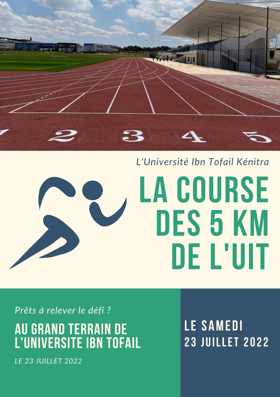 ضمن أنشطته الرياضية المتنوعة ينظم معهد مهن الرياضة التابع لجامعة ابن طفيل السباق الرياضي الأول – الطريق 5 كيلومتر، وذلك يوم السبت 23 يوليوز2022 بمطاف الحرم الجامعي، وستشهد هذه التظاهرة الرياضية مشاركة أبطال مغاربة وأجانب بالإضافة الى طلبة الجامعات والمعاهد العليا من كل ربوع المملكة.