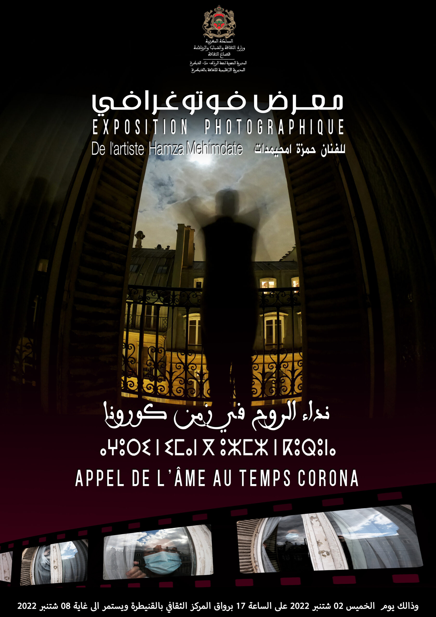 بعد عرض أول لمعرضه الفوتوغرافي الذي اختار له عنوان “نداء الروح في زمن كورونا”، بمدينة الرباط، يحط الفنان الفوتوغرافي حمزة محيمدات بمعرضه في مدينة القنيطرة برواق المركز الثقافي ما بين 02 و8 شتنبر 2022، بدعم من المديرية الاقليمية لقطاع الثقافة.