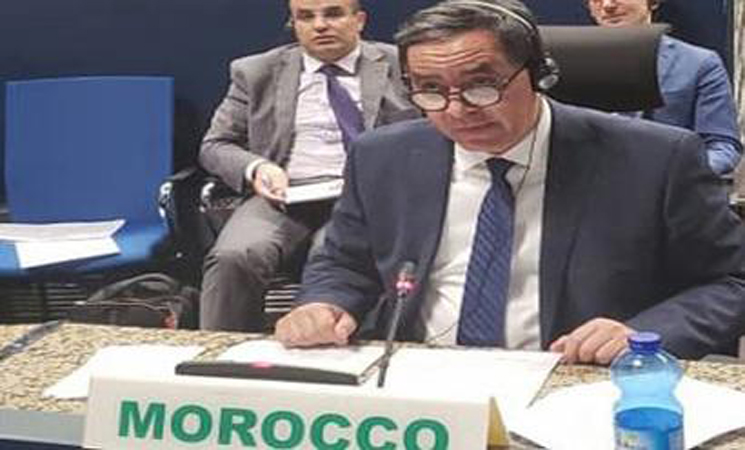 وخلص الدبلوماسي المغربي إلى التأكيد على رؤية المملكة في ظل القيادة الرشيدة لصاحب الجلالة الملك محمد السادس، الهادفة إلى توحيد القارة ، والاستجابة بطريقة مسؤولة وملتزمة وفعالة لتطلعات المواطنين الأفارقة لإنهاء النزاعات وضمان السلم والأمن والاستقرار والمساهمة في توفير الظروف الأساسية الكفيلة بضمان حياة مزدهرة تمكن الشعوب والقارة الإفريقية من تبوأ المكانة التي يستحقونها على الساحة الدولية.