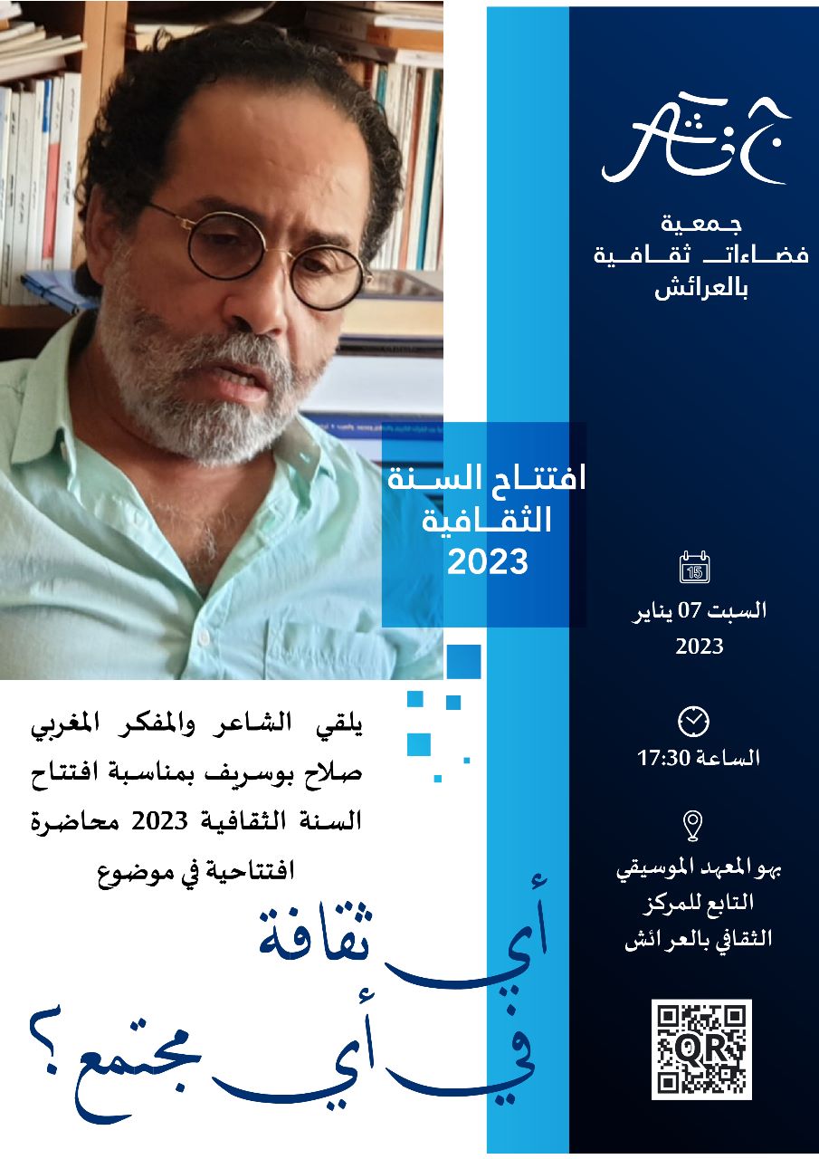 تنظم جمعية فضاءات ثقافية بمدينة العرائش، محاضرة افتتاحية، بمناسبة افتتاح موسمها الثقافي الجديد، مع الشاعر والمفكر صلاح بوسريف، في موضوع، هو عبارة عن سؤال راهن يهم الثقافة في علاقتها بالمجتمع، أو ما الطبيعة الثقافية للمجتمع الثقافي، أو مجتمع المعرفة، بعنوان “أي ثقافة، لأي مجتمع ؟”، وذلك يوم السبت 07 يناير 2023، على الساعة 17.30، ببهو المعهد الموسيقي التابع للمركز الثقافي بالعرائش، مع توقيع لبعض الإصدارات الشعرية والنظرية الحديثة للشاعر صلاح بوسريف.