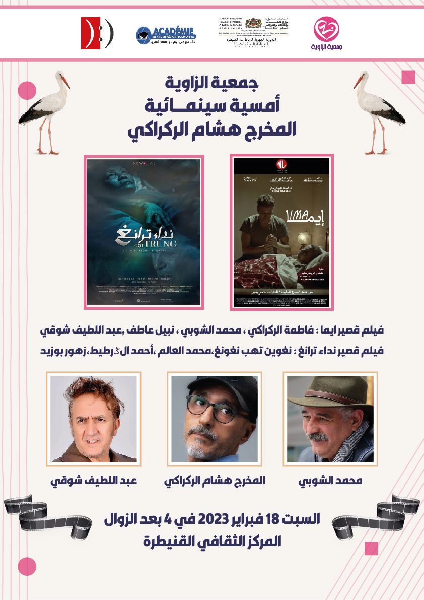 ستعرض فيها فيلمين قصيرين للمخرج محمد هشام الرݣراݣي من أبناء مدينة القنيطرة ، بحضور المخرج والممثلين: