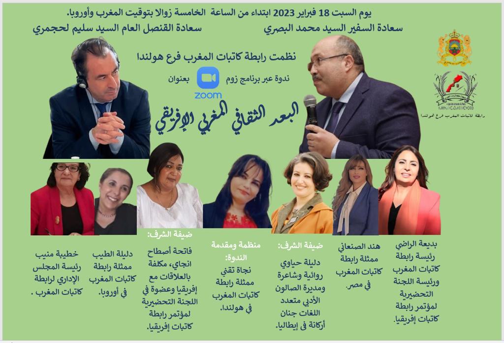 في إطار الاستعداد المكثف لعقد مؤتمر رابطة كاتبات إفريقيا الذي سينعقد يومي 9 و10 مارس 2023 في عاصمة المغرب الرباط، نظمت الروائية نجاة تقني ممثلة رابطة كاتبات المغرب فرع هولندا يوم السبت 18 فبراير 2023 ندوة افتراضية عبر برنامج زوم بعنوان ” البعد الثقافي المغربي الإفريقي.”