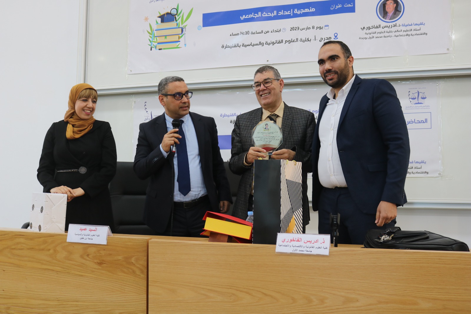 احتضنت كلية العلوم القانونية والسياسية بجامعة ابن طفيل بالقنيطرة طيلة يوم الأربعاء 08 مارس 2023، محاضرتين افتتاحيتين في إطار برنامج المحاضرات الموجة لفائدة طلبة سلك الدكتوراه والماستر والإجازة، ألقاهما الدكتور إدريس الفاخوري أحد أهرامات الأساتذة الأجلاء المتخصصين في مجال قانون الأسرة وقانون العقود والعقار الذين لهم الفضل في اخراج العديد من القضاة والمحامون ورجال القانون.