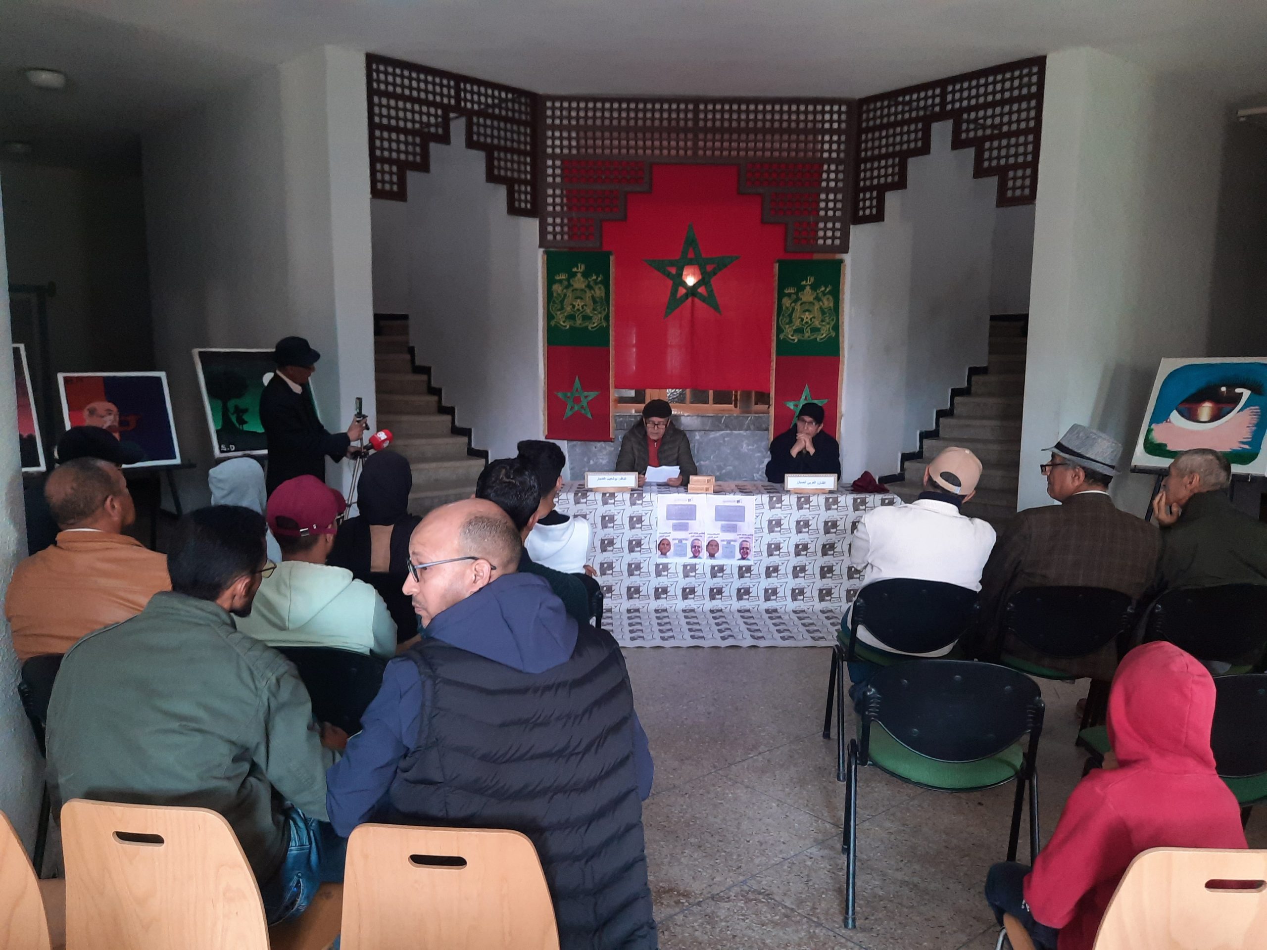اللقاء انطلق بافتتاح معرض رسومات الفنان المحتفى به وتضم أزيد من 60 رسم كاريكاتور، مع تقديم بعض الشروحات من طرف الصبان.