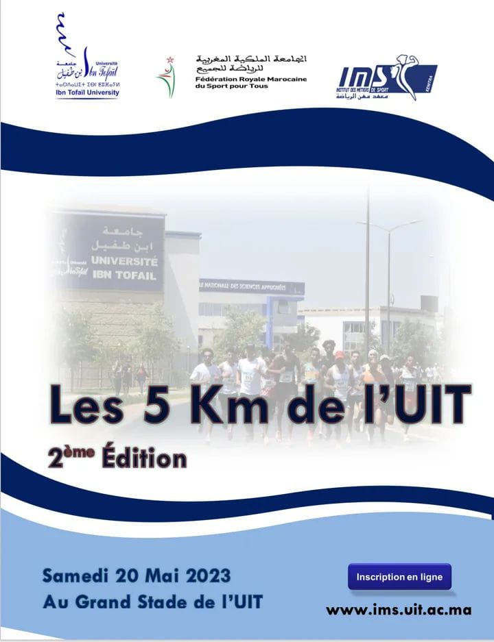 يعتزم معهد مهن الرياضة التابع لجامعة ابن طفيل بشراكة مع الجامعة الملكية المغربية للرياضة للجميع تنظيم النسخة الثانية من السباق على الطريق 5 كليومتر بالمركب الجامعي وذلك يوم 20 ماي 2023
