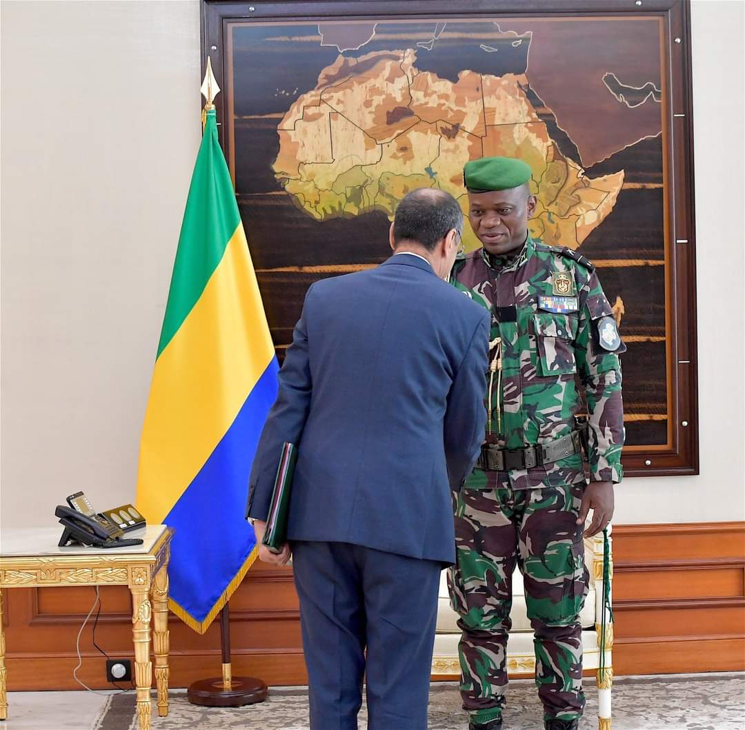 بخريطة مغربية كاملة خلفه و بشعار القوات المسلحة الملكية على صدره و رمزها الله الوطن الملك..الجنرال بريس أوليغي أنغيما، قائد المرحلة الانتقالية في الغابون يستقبل سفير المغرب