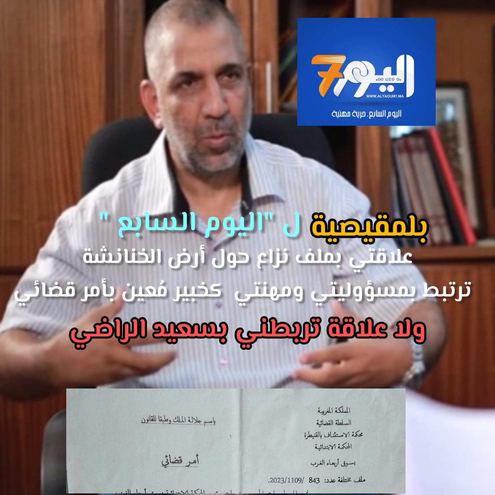 وزاد موضحا ؛المتحدث نفسه ؛في اتصال هاتفي ب “اليوم السابع ” أنه ليس طرفا ولاعلاقة له بسعيد الراضي وذلك ردا وتوضيحا على مانشرناه في مادة سابقة .