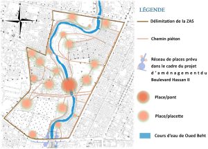 - إعطاء الأولوية للراجلين عبر تهيئة مسارات تربط بين مختلف مكونات المشروع بالإضافة إلى مجالات مفتوحة متمثلة في ساحات عمومية، مساحات خضراء و شرفات مطلة على النهر؛