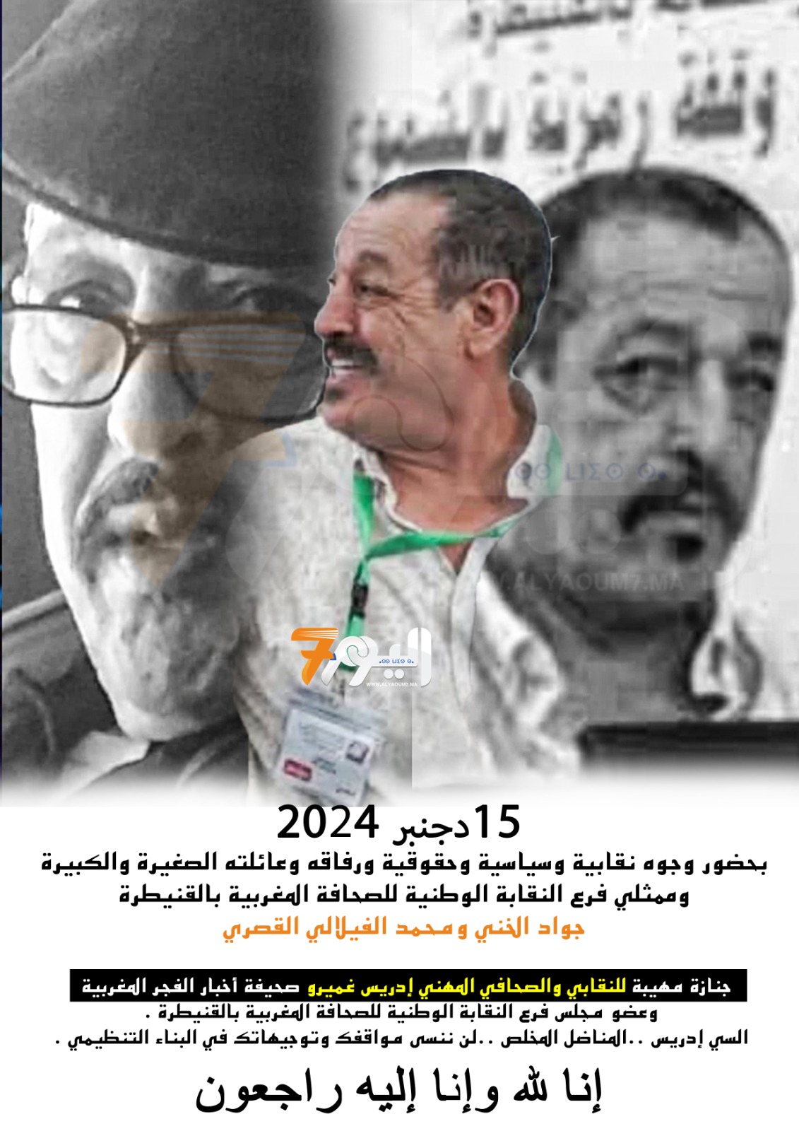 تعزية في وفاة الوَجْهِ النقابي الكبير والزميل الصحافي المهني بصحيفة “أخبار الفجر المغربية ” الفقيد إدريس غميرو