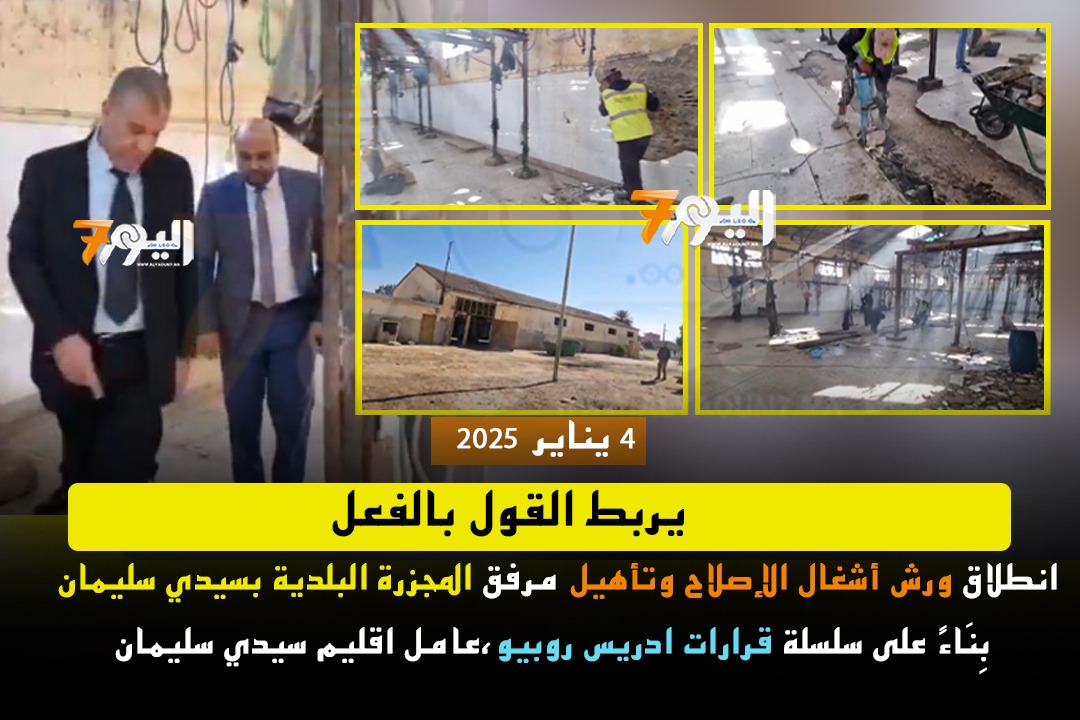 اُطْلقَت الأشغال بالمجزرة البلدية بسيدي سليمان صباح يومه السبت 4 يناير 2025 قصد إعادة تأهيل وإصلاح منشأة هذا المرفق الحيوي الهام الذي يرتبط بالجزارة المهنيين ويرتبط أساسا بالسلامة والصحة العمومية.