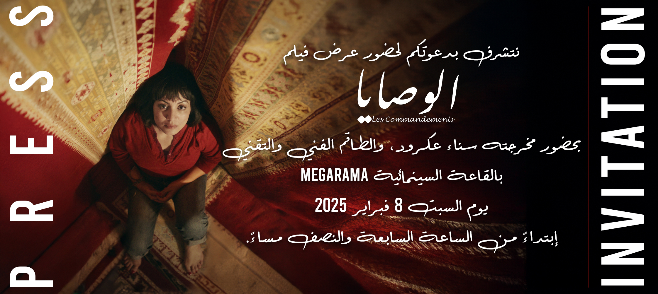 Nous avons le plaisir de vous inviter à assister et à couvrir la projection du film *Les Commandements*, réalisé par **Sanae Akroud**, qui se tiendra le **samedi 8 février 2025** au cinéma **Mégarama – Casablanca**, à partir de **19h30**, en présence de la réalisatrice ainsi que de l’équipe artistique et technique du film.