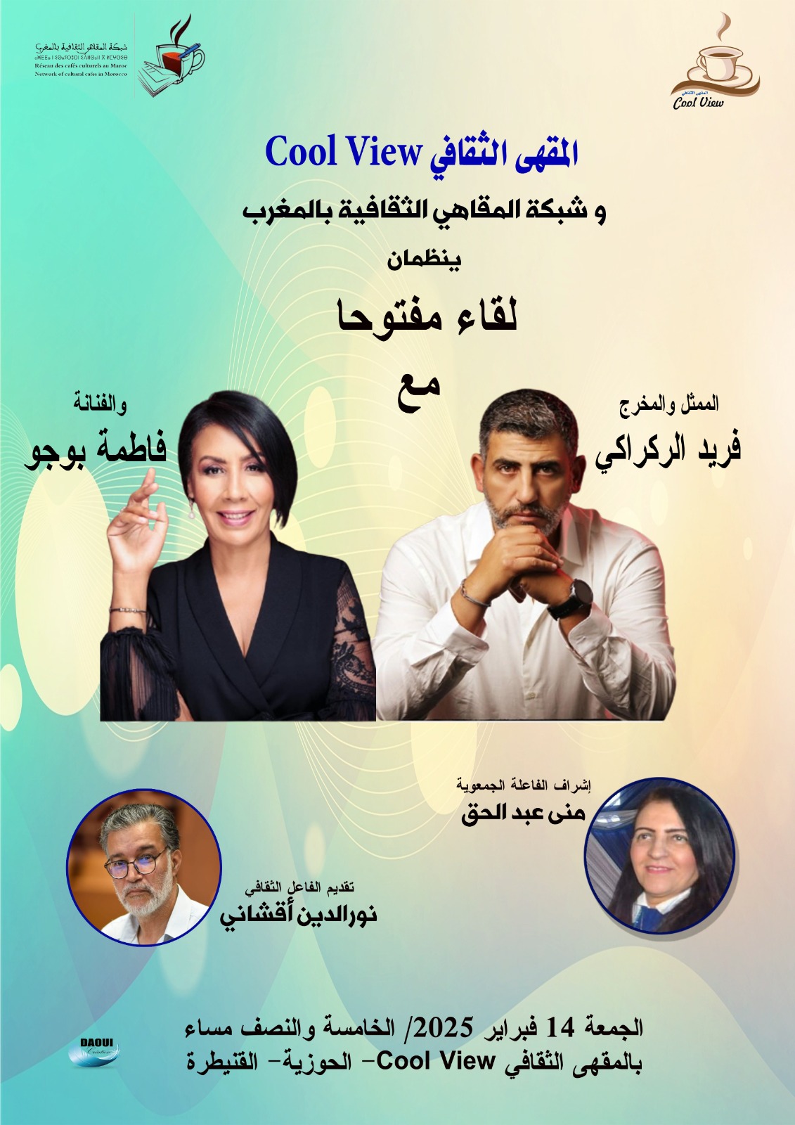 ضمن برامج شبكة المقاهي الثقافية بالمغرب الثقافية والإشعاعية للموسم الثقافي /الجمعوي الحالي 2024-2025 ، استضافة المخرج والفنان فريد الركراكي والفنانة فاطمة بوجو ، في لقاء مفتوح ، وذلك يوم الجمعة 14 فبراير 2025 بمقهى cool view بالحوزية بمدينة القنيطرة إبتداء من الساعة الخامسة والنصف مساء .