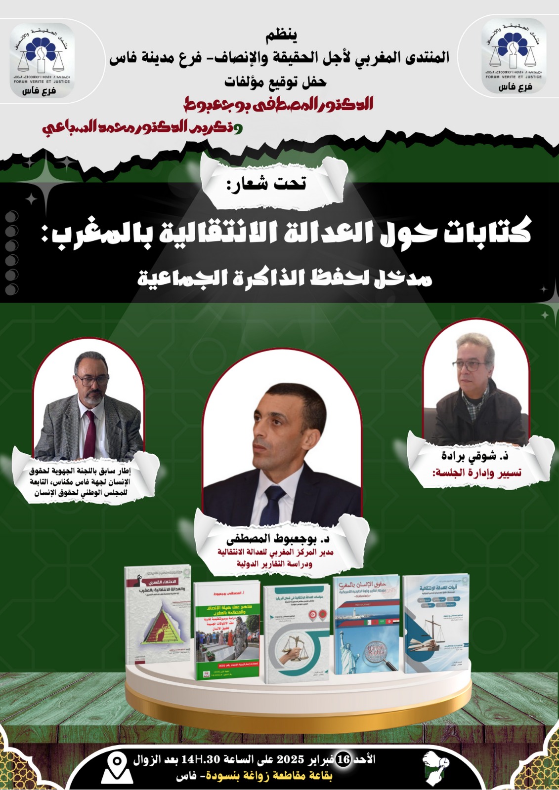 نظم المنتدى المغربي لأجل الحقيقة والانصاف- فرع فاس حفل قراءة وتوقيع كتب الدكتور الباحث بوجعبوط المصطفى، مدير المركز المغربي للعدالة الانتقالية ودراسة التقارير الدولية والمدير المسؤول على المجلة المغربية للعجالة الانتقالية وحقوق الانسان، تحت شعار: “كتابات حول العدالة الانتقالية بالمغرب: مدخل لحفظ الذاكرة الجماعية”، وذلك يوم الأحد 16 فبراير 2025 بمقاطعة زواغة بنسودة فاس.