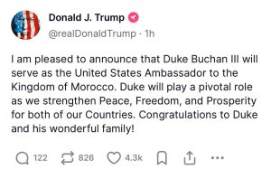 وقال الرئيس دونالد ترامب، في منشور على شبكته الاجتماعية (تروث سوشال): “يسعدني أن أعلن أن ديوك بوكان الثالث سيشغل منصب سفير الولايات المتحدة لدى المملكة المغربية”.