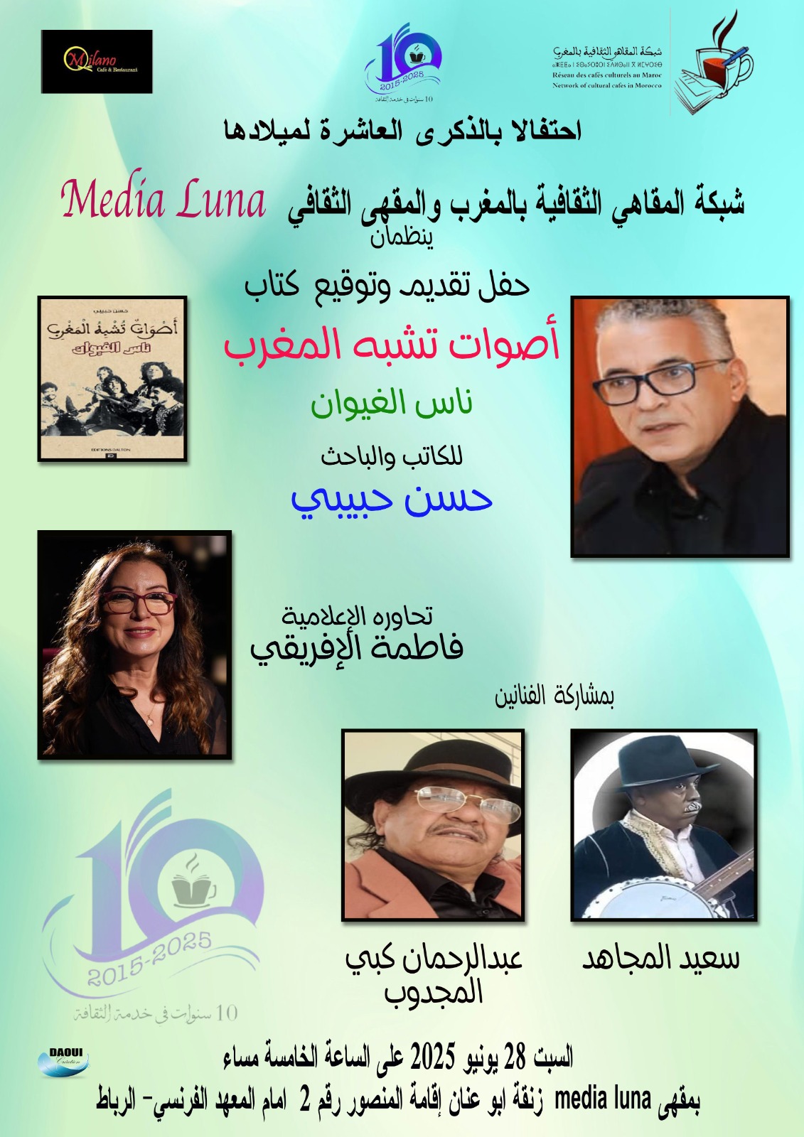 كما تستضيف شبكة المقاهي الكاتب والباحث حسن حبيبي في حفل تقديم وتوقيع إصداره الجديد ” أصوات تشبه المغرب ” ناس الغيوان يوم السبت 28 يونيو 2025 على الساعة الخامسة مساء بمقهى Media luna ” أمام المعهد الثقافي الفرنسي .