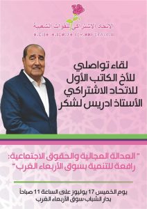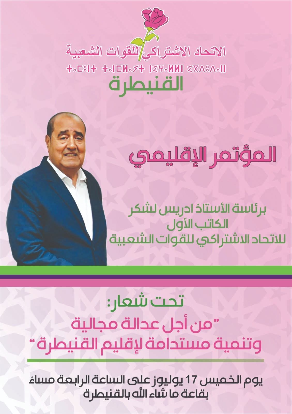 ضمن الدينامية التنظيمية وسط أجهزة حزب الاتحاد الاشتراكي بمختلف الحهات والمناطق ،برمجت أشغال المؤتمر الإقليمي السادس، وذلك يوم الخميس 17 يوليوز الجاري على الساعة الرابعة مساء (16h00) بقاعة ما شاء الله بالقنيطرة، تحت شعار: “من أجل عدالة مجالية وتنمية مستدامة لإقليم القنيطرة”، وذلك برئاسة الكاتب الأول للحزب إدريس لشكر.