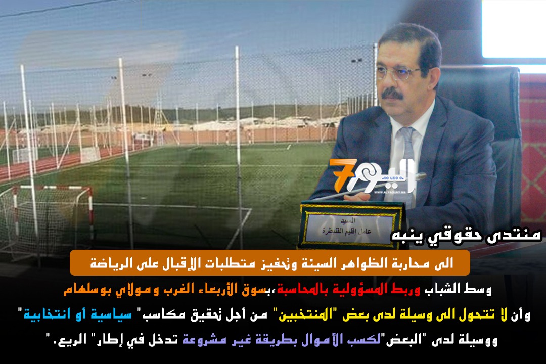 منتدى حقوقي يطالب عامل إقليم القنيطرة عبد الحميد المزيد بالتدخل لإعمال مبادئ وقواعد الحكامة الجيدة في تدبير قطاع الشباب والرياضة بسوق الأربعاء الغرب ومولاي بوسلهام