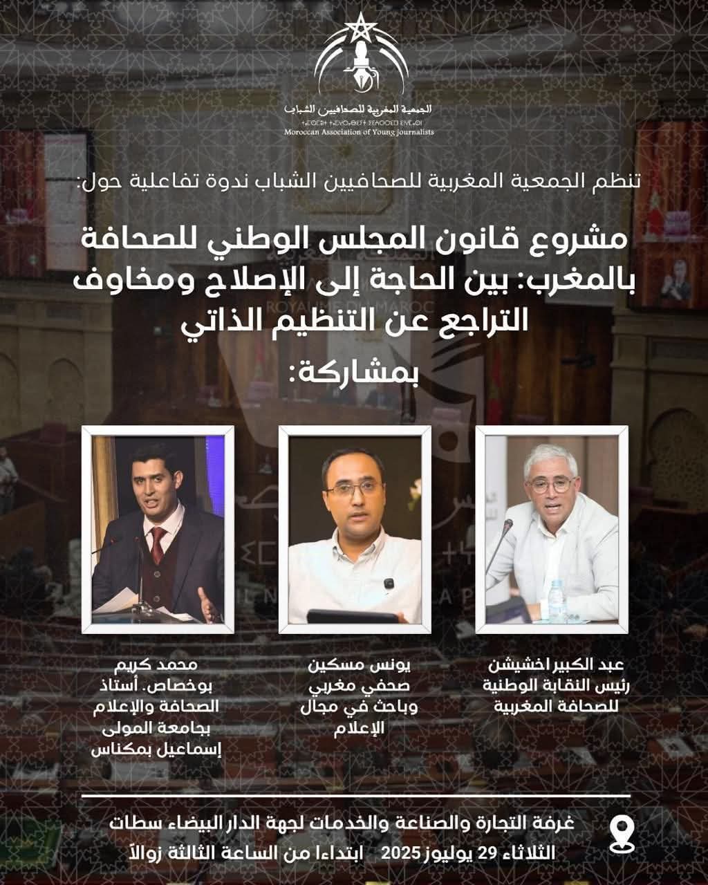 تنظم الجمعية المغربية للصحافيين الشباب ندوة تفاعلية حول موضوع: “مشروع قانون المجلس الوطني للصحافة بالمغرب: بين الحاجة إلى الإصلاح ومخاوف التراجع عن التنظيم الذاتي”