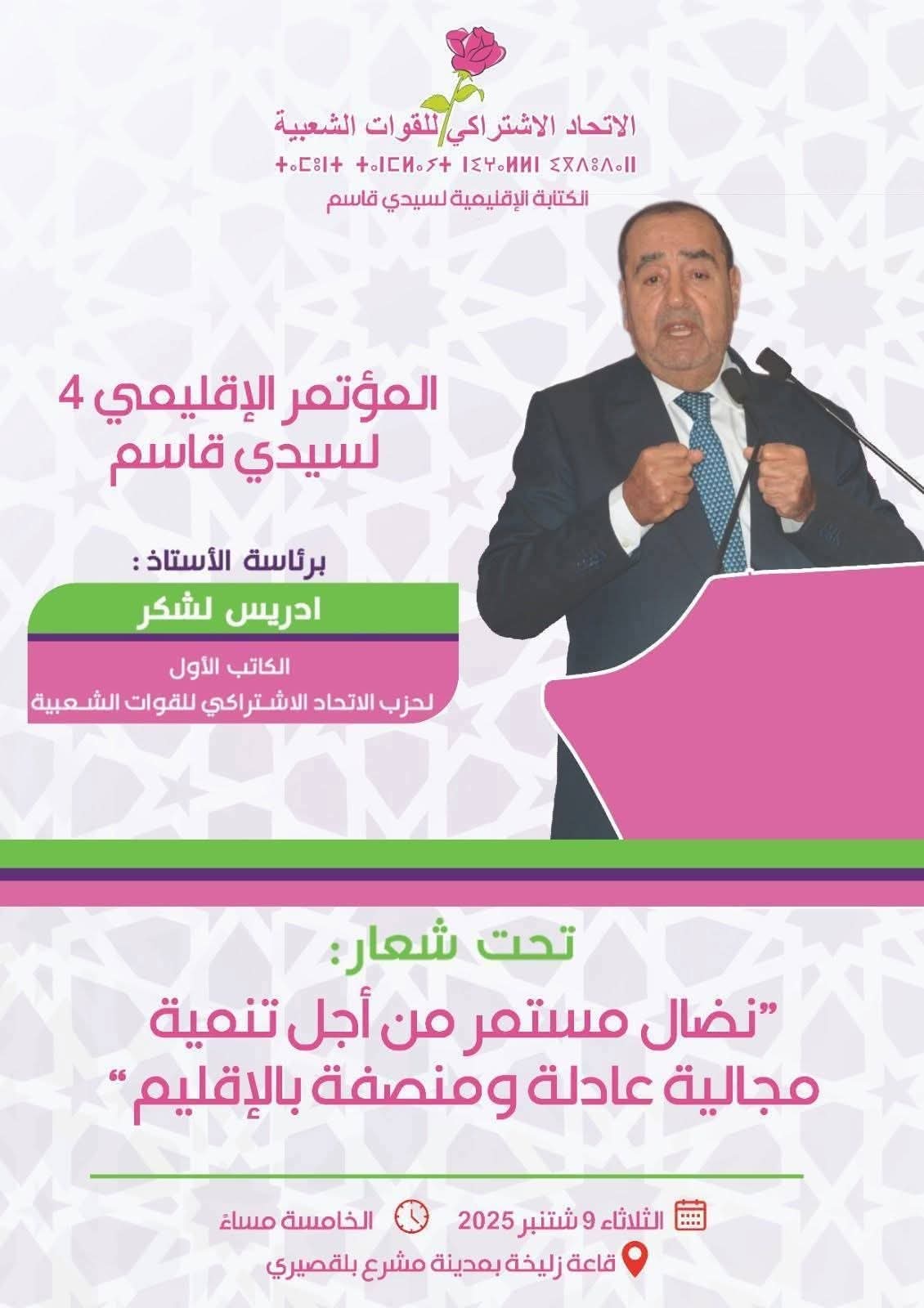 يترأس الكاتب الأول لحزب الاتحاد الاشتراكي إدريس لشكر أشغال المؤتمر الإقليمي الرابع لاقليم سيدي قاسم تحت شعار “نضال مستمر من أجل تنمية مجالية عادلة ومنصفة بالإقليم “ مساء يوم الثلاثاء 09 شتنبر 2025 على الساعة الخامسة مساء بقاعة زليخة بمشرع بلقصيري.