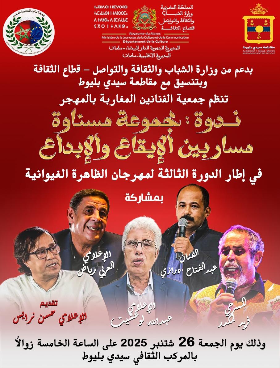 بدعم من وزارة الشباب والثقافة والتواصل – قطاع الثقافة، وبتنسيق مع مقاطعة سيدي بليوط، تنظم جمعية الفنانين المغاربة بالمهجر ندوة حول تجربة مجموعة مسناوة “مسار بين الإيقاع والإبداع” في إطار الدورة الثالثة لمهرجان الظاهرة الغيوانية “دورة الأستاذ بلحاج وكيل أعمال مجموعة ناس الغيوان منذ سنة 1974″. هذه الندوة التكريمية ستنظم يوم الجمعة 26 شتنبر 2025 على الساعة الخامسة زوالا بالمركب الثقافي سيدي بليوط بمشاركة كل من الفنان عبد الفتاح ورازي والمسرحي فريد لمكدر والإعلاميين العربي رياض وعبد الله لوغشيت، يقدمها ويدير أشغالها الإعلامي حسن نرايس.