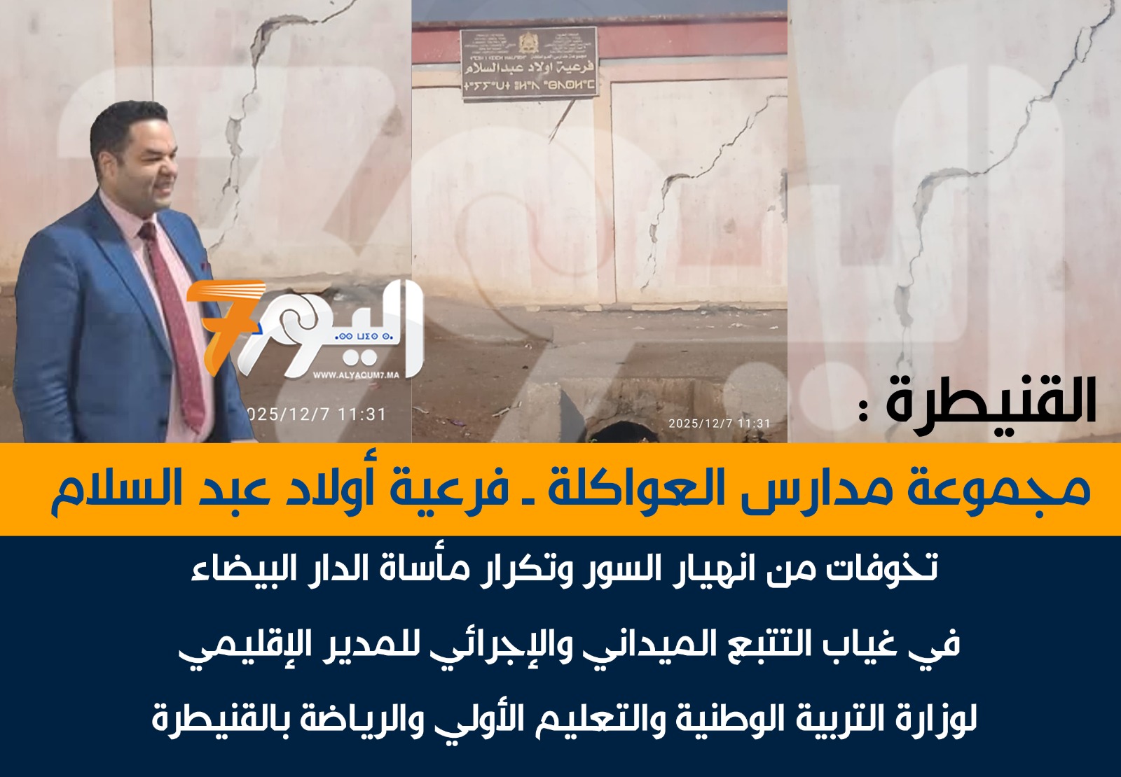 والغريب سلبية وتراخي المديرية الاقليمية لوزارة التربية الوطني واتلتعليم الأولي والرياضة بالقنيطرة في إجراء خبرة تقنية على المؤسسة واتخاذ الاجراءات العاجلة لوقف الدراسة خاصة وأن هناك بناية مدرسية وأقسام جديدة لذات المؤسسة وحدة أولاد عبد السلام ،لم يتم تسليمها أو تم تسليمها ولم يتم فتح أبوابها في غياب معطيات رسمية،وماذا عن معايير وشروط الجودة ،هل احترمت وفق دفتر التحملات وأسئلة أخرى تحتاج الى أجوبة ؟؟