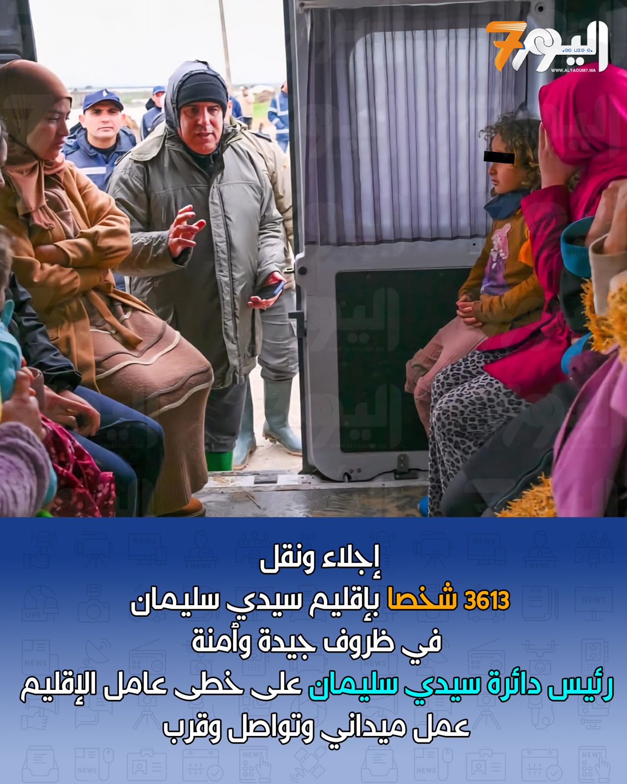 هذا ،وتستمر عمليات الإجلاء لسكان دواوير أولاد احسين المعنية بمخاطر السيول الجارفة، وفق مقاربة تراعي درجات الخطورة وحجم الأضرار المحتملة، مع تسخير مختلف الوسائل اللوجستيكية لضمان نقل الأشخاص المتضررين في أفضل الظروف الى فضاءات آمنة جهزت بسيدي سليمان من ضمنها بالمركب الترفيهي بالقصيبية وتهيئة الملعب البلدي .وفضاءات أخرى مناسبة كدار الطالبة ودار الطالب ودار العجزة ومؤسسات تعليمية ومراكز .