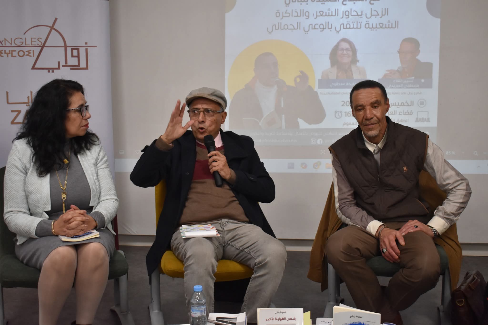 أتى هذا اللقاء في سياق البرنامج الثقافي للمركز والجمعية الهادف إلى ترسيخ تقاليد الحوار الأدبي والفكري، وتعزيز النقاش حول قضايا الإبداع وأسئلته الجمالية. وحمل اللقاء عنوان: “الزجل يحاور الشعر، والذاكرة الشعبية تلتقي بالوعي الجمالي»، وقد أسهم التوقف عند ملامح التجربة الإبداعية للضيف، واستجلاء تقاطعات الزجل مع الشعر، ودور الذاكرة الشعبية في بناء الرؤية الجمالية وتشكيل الحس الإبداعي للكتابة بين المعرب والزجل في تأطير هذا اللقاء من خلال مشاركة الدكتورة مليكة معطاوي، شاعرة وباحثة في الدراسات المقارنة والترجمة عبر قراءة لتجربة الشاعر احميدة بلبالي ؛فيما تولى تسيير الجلسة بمتعة الإلقاء وسبر أغوار التجربة الابداعية للمحتفى به من وحي تقديم للشاعر والزجال مصطفى العبريدي عضو جمعية زوايا