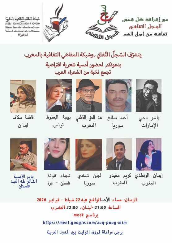 ضمن علاقات الشراكة والتعاون ينظم السجل الثقافي بلبنان ، وشبكة المقاهي الثقافية بالمغرب ، أمسية شعرية إفتراضية تجمع نخبة من الشعراء العرب وذلك يوم الأحد 22 شباط /فبراير 2026 في الساعة التاسعة ليلا بتوقيت لبنان ،العاشرة بتوقيت المغرب عبر برنامج Meet .