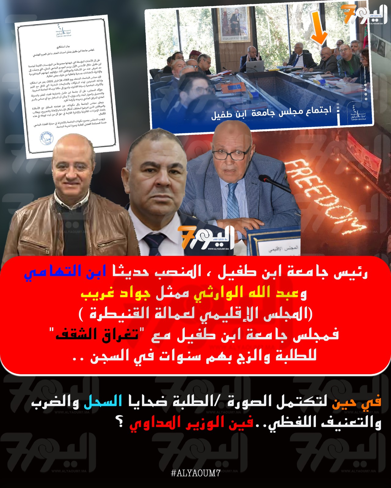 تزامنا والنطق بالأحكام الابتدائية التي أدانت الطلبة المعتقلين الأربعة والمتابعين العشرة في حالة السراح وهم :( الأربعة عشر) في ملف مقاطعة الامتحانات بجامعة ابن طفيل والموقف من القانون 59.24 بإسقاطه،بشهرين نافذة وغرامة مالية ،وبعد انتظار طويل وعريض خرجت رئاسة جامعة ابن طفيل من خلال مؤسسة مجلس جامعة ابن طفيل بما سمته بيان استنكاري يدين الطلبة قبل الحكم الحائز لقوة الشيء المقضي به في سابقة ..
