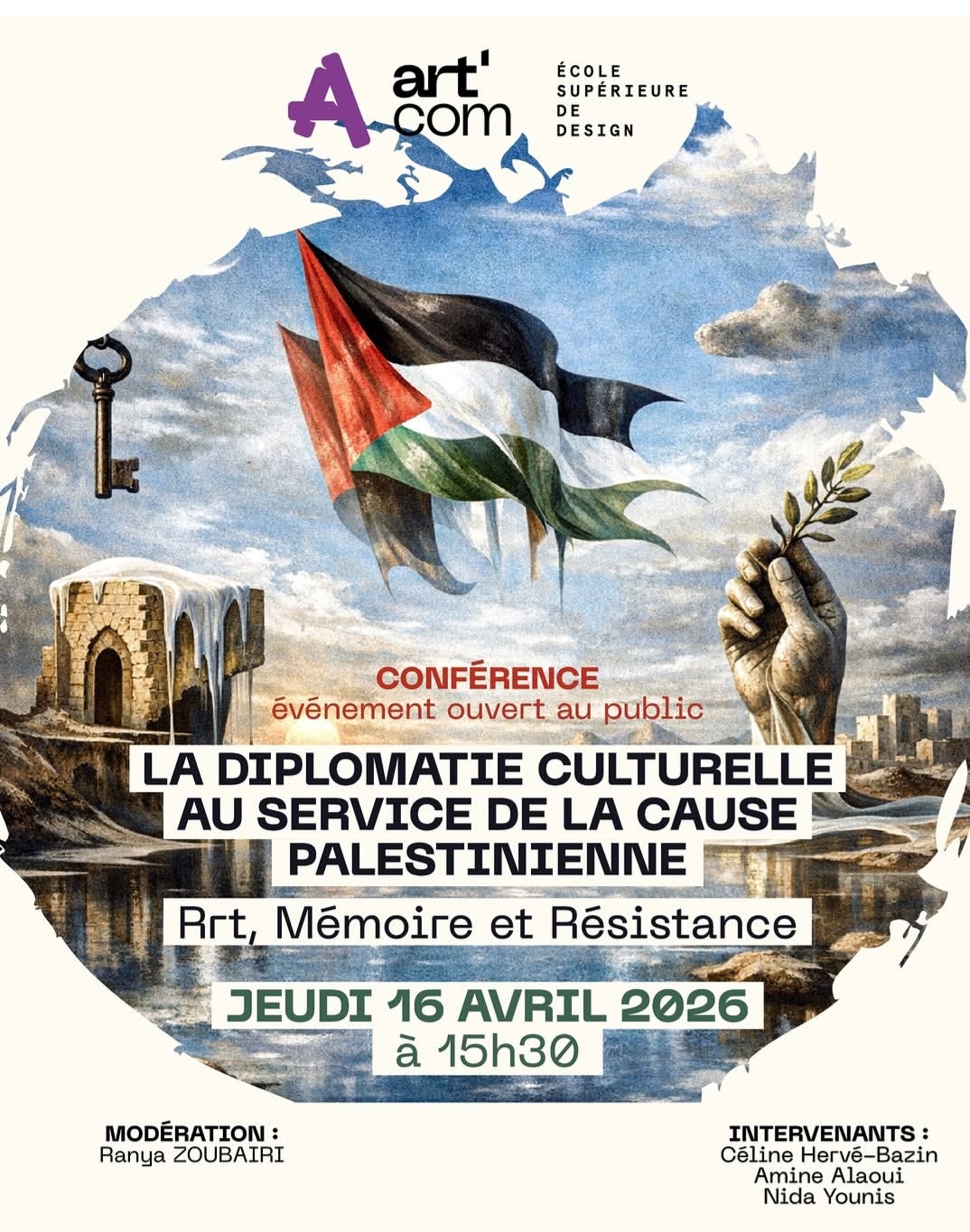 Dans le cadre des activités de médiation culturelle portées par le Laboratoire de Recherche et d’Innovation en Design et Communication (RIDEC-Rabat), Art’Com Sup organise, le jeudi 16 avril 2026 à partir de 15h30, une rencontre ouverte au public autour du thème : « La diplomatie culturelle au service de la cause palestinienne : art, mémoire et résistance ».