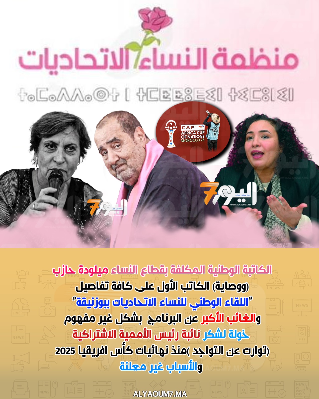 الأمر غير العادي،برمج الحزب بإشراف مباشر من الكاتب الأول ماسماه “الملتقى الوطني للنساء الاتحاديات”، أيام: 16 -17 -18 أبريل 2026 بمجمع مولاي رشيد للشباب والطفولة ببوزنيقة تحت شعار “”معا النسا يكون التغيير والربح والتسير” وهو الشعار الذي حول حالة حزب كان يصنع المعنى ومدرسة في الفكر النقدي إلى يافطة اسمية باهتة..شعار بلا مضمون ولا هوية سياسية أو قيمية في إفلاس لغوي وسياسي…